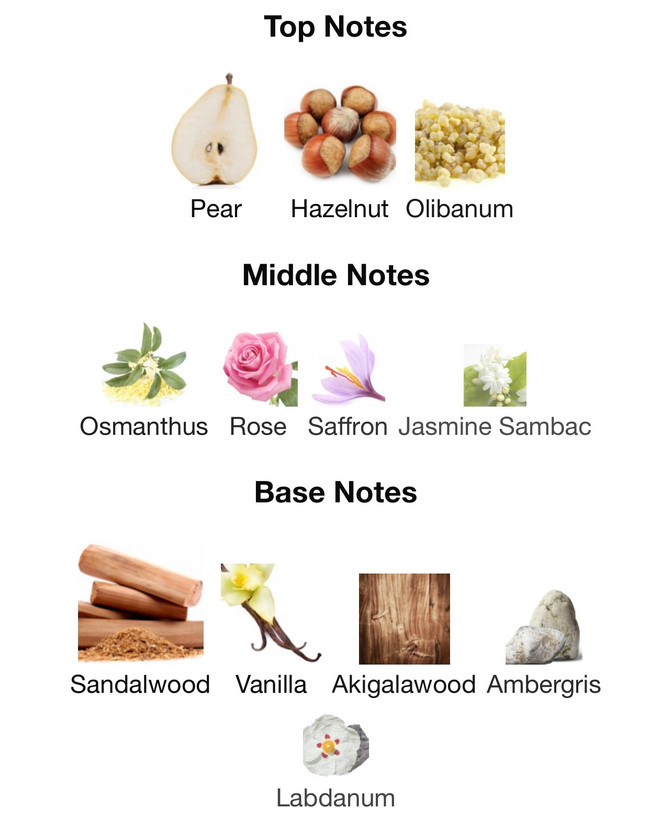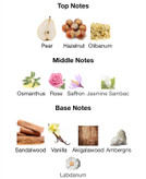 ترکیب خاصی از گلابی، کندر، رز، وانیل و چوب صندل که حسی شاعرانه، آرام و در عین حال قدرتمند ایجاد میکند.