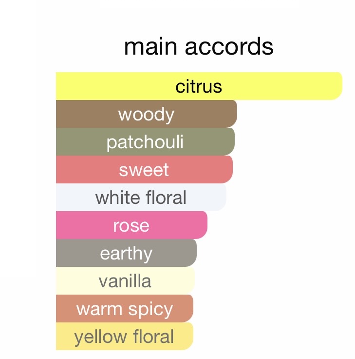 در ترکیب این عطر، رایحهی مرکبات تازه در ابتدا به مشام میرسد، سپس نتهای گلی ظریف و لطیف مانند یاسمین و رز نمایان میشوند و در پایان با گرمای وانیل، نعناع هندی و مشک، رایحهای ماندگار و اغواگر بر جای میگذارد.