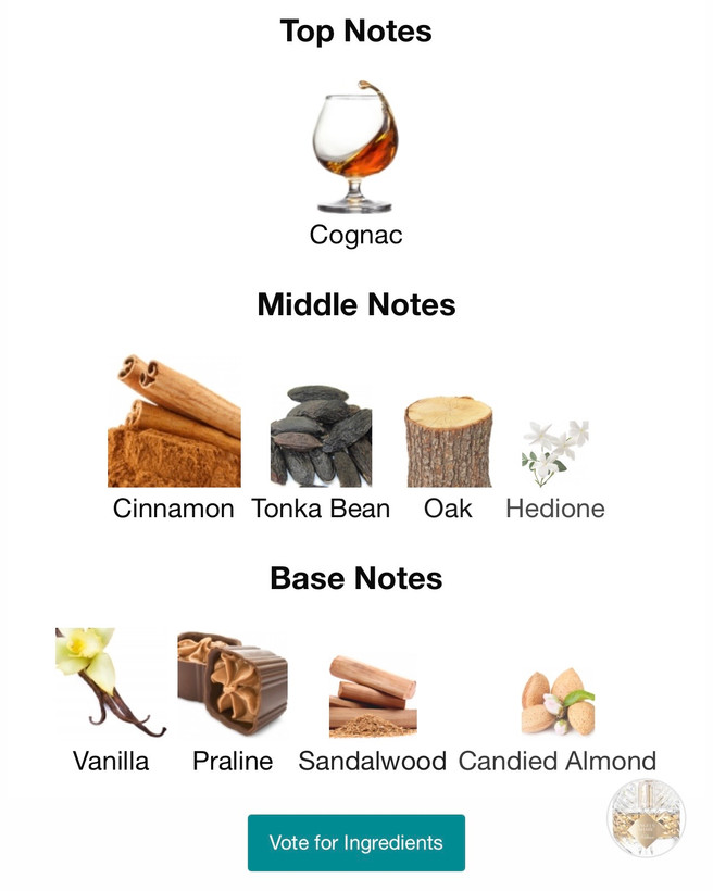 در ابتدای بو، نت کنیاک و دارچین حسی گرم و لذیذ ایجاد میکنند؛ سپس نتهای فندق، بلوط و دانه تونکا ظاهر میشوند و ترکیبی جذاب از شیرینی و عمق را میسازند. در پایان، وانیل و پرالین عطر را با لطافت و ماندگاری بالا کامل میکنند.