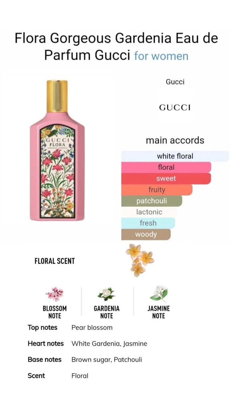 Flora Gorgeous Gardenia با شروعی میوهای و شاد آغاز میشود؛ سپس رایحهی گل گاردنیا و یاس فضا را پر میکند و در پایان، گرمای لطیف وانیل و شکر قهوهای حس دلنشین و زنانهای به عطر میبخشد.